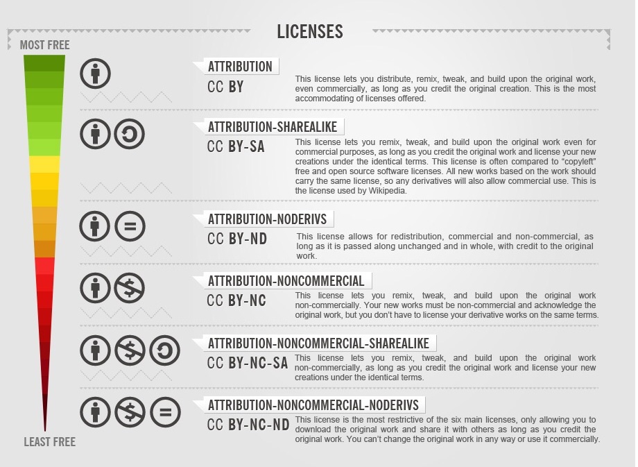 크리에이티브 커먼즈 내에서 구체적으로 본다면 강도나 자유도가 나뉘는데 위로 갈수록 상업적 이용 및 변형이 자유롭다.