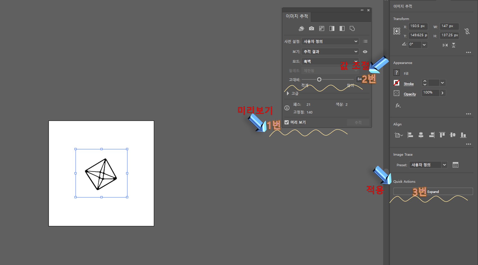 image trace 아래와 같이 이미지 추적 도구가 활성화된다. 하단부 미리보기에 체크박스를 체크하고 값을 조절해 원하는 모습을 찾은뒤 선택하고 Expand를 눌러 이미지 파일을 벡터화 시킨다.